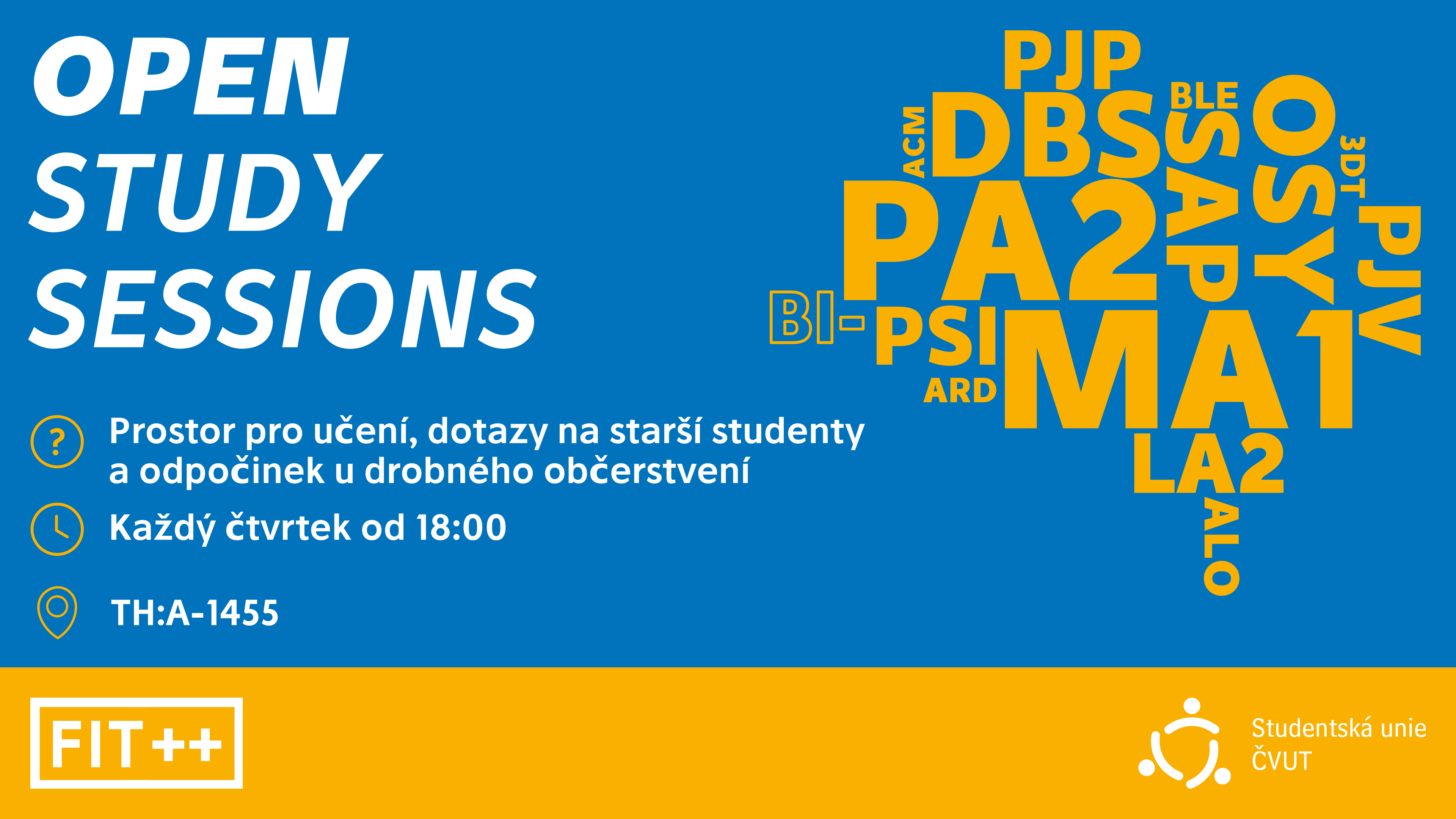 Stejně jako v předchozím semestru, i tento rok se můžete těšit na Open Study Sessions s FIT++, vždy v TH:A-1455 ve čtvrtek od 18:00 a tentokrát po celou dobu semestru.